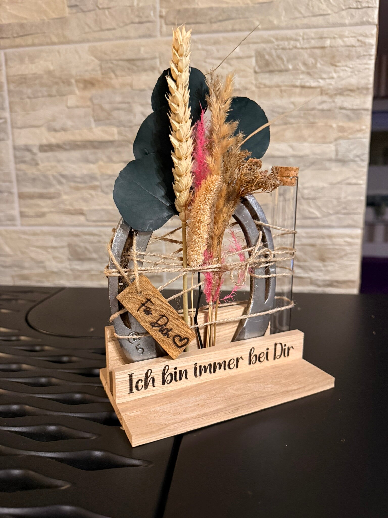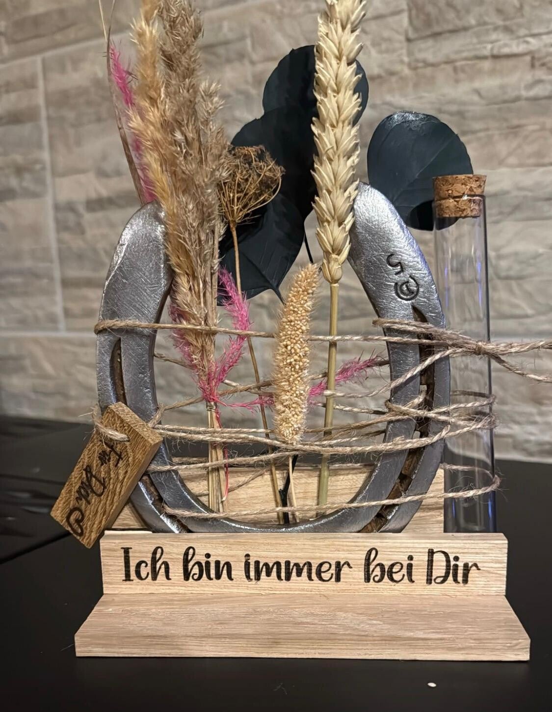 Dieses dekorative Set besteht aus einem echten Hufeisen, das in einem hochwertigen Holzständer steht und liebevoll mit Trockenblumen verziert ist. Ein besonderes Highlight ist das kleine Reagenzglas mit Korken, in das du z.B. Geldscheine oder Pferdehaare als persönliche Erinnerung legen kannst.