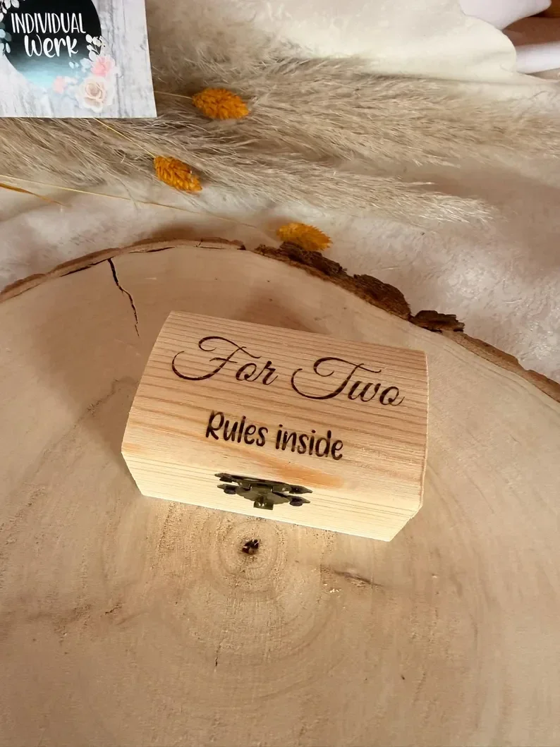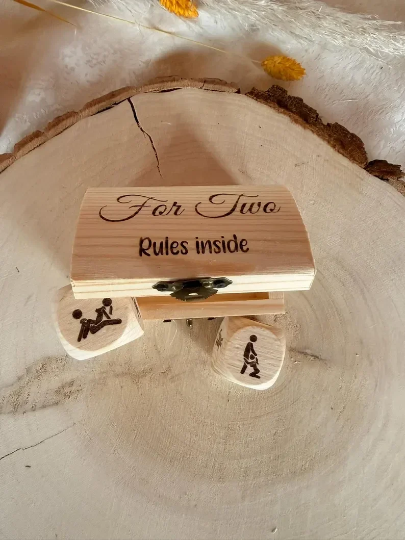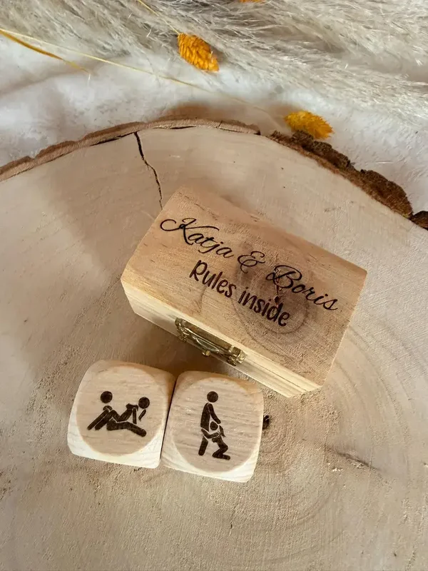 Die zwei Holzwürfel zeigen spielerische Positions-Motive und lassen Raum für Interpretation – liebevoll, humorvoll oder sinnlich. Ganz so, wie es zu euch passt.